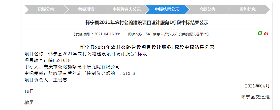 公司中標懷寧縣2021年農(nóng)村公路建設(shè)項目設(shè)計服務(wù)1標段